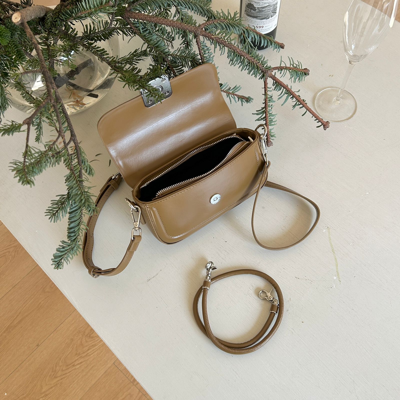Straps: Adjustable cross body strap and shoulder strap.